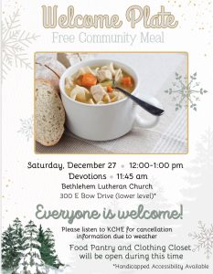 Bethlehem Lutheran Church – Welcome Plate/Free Community Meal + Add to Google Calendar + iCal / Outlook export 00 days 00 hours 00 minutes 00 seconds Date Dec 27 2025 Time 11:45 am Location Bethlehem Lutheran Church Share this event