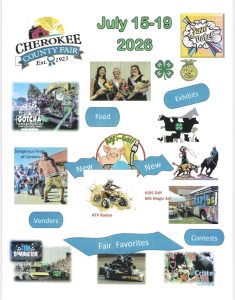 Cherokee County Fair + Add to Google Calendar + iCal / Outlook export 00 days 00 hours 00 minutes 00 seconds Date Jul 15 - 19 2026 Location Cherokee County Fairgrounds Share this event