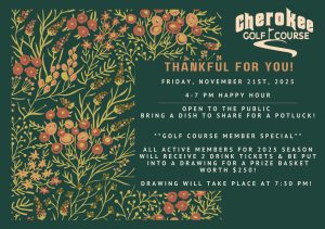Cherokee Golf Course – Thankful for You Event + Add to Google Calendar + iCal / Outlook export 00 days 00 hours 00 minutes 00 seconds Date Nov 21 2025 Time 4:00 pm - 7:00 pm Location Cherokee Golf Course Share this event