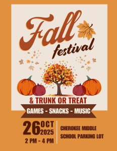 Cherokee PTA Fall Festival & Trunk or Treat + Add to Google Calendar + iCal / Outlook export 00 days 00 hours 00 minutes 00 seconds Date Oct 26 2025 Time 2:00 pm - 4:00 pm Location Cherokee Middle School Share this event