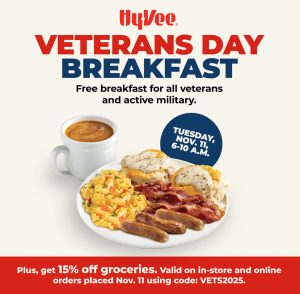 Hy-Vee Veterans Day Breakfast + Add to Google Calendar + iCal / Outlook export Date Nov 11 2025 Expired! Time 6:00 am - 10:00 am Location Hy-Vee Share this event