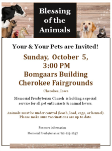 Memorial Presbyterian Church – Blessings of the Animals + Add to Google Calendar + iCal / Outlook export Date Oct 05 2025 Expired! Time 3:00 pm Location Cherokee County Fairgrounds Share this event