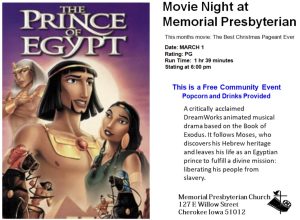 Movie Night at Memorial Presbyterian + Add to Google Calendar + iCal / Outlook export 00 days 00 hours 00 minutes 00 seconds Date Mar 01 2026 Time 6:00 pm Location Memorial Presbyterian Church Share this event