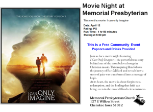 Movie Night at Memorial Presbyterian + Add to Google Calendar + iCal / Outlook export 00 days 00 hours 00 minutes 00 seconds Date Apr 12 2026 Time 6:00 pm - 8:00 pm Location Memorial Presbyterian Church Share this event