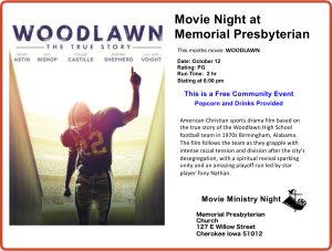Movie Night at Memorial Presbyterian + Add to Google Calendar + iCal / Outlook export 00 days 00 hours 00 minutes 00 seconds Date Oct 12 2025 Time 6:00 pm - 8:00 pm Location Memorial Presbyterian Church Share this event