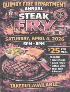 Quimby Fire Department Annual Steak Fry + Add to Google Calendar + iCal / Outlook export Date Apr 04 2026 Expired! Time 5:00 pm - 8:00 pm Location Quimby Fire Station Share this event
