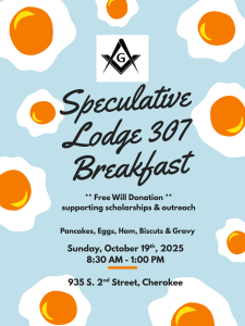 Speculative Lodge 307 Breakfast + Add to Google Calendar + iCal / Outlook export 00 days 00 hours 00 minutes 00 seconds Date Oct 19 2025 Time 8:30 am - 1:00 pm Location 935 S 2nd St Cherokee Share this event