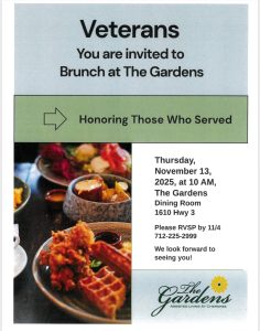 The Gardens Assisted Living – Veterans Brunch + Add to Google Calendar + iCal / Outlook export 00 days 00 hours 00 minutes 00 seconds Date Nov 13 2025 Time 10:00 am Location The Gardens 1610 Highway 3 Share this event