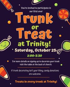 Trinity Lutheran Church – Trunk or Treat + Add to Google Calendar + iCal / Outlook export Date Oct 25 2025 Expired! Time 2:00 pm - 3:30 pm Location Trinity Lutheran Church 230 N. Roosevelt Avenue, Cherokee, IA 51012 Share this event