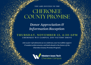 Western Iowa Tech – Cherokee County Promise Donor Appreciation + Add to Google Calendar + iCal / Outlook export Date Nov 13 2025 Expired! Time 4:00 pm - 6:30 pm Location Western Iowa Tech Community College Share this event